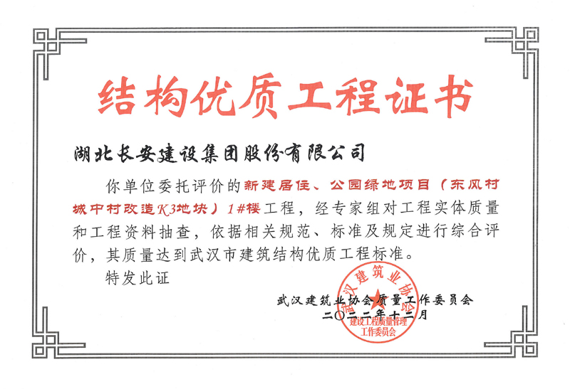 東風村城中村改造k3地塊1#、2#、4#樓獲評“武漢市建筑結構優質工程”
