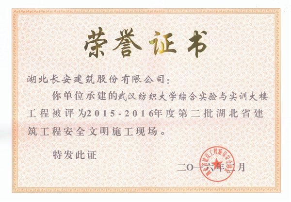 武漢紡織大學綜合實驗與實訓大樓被評為2015-2016年度第二批省安全文明施工現場