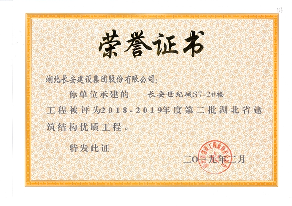 長安世紀城S7-2#樓工程被評為2018-2019年度第二批省結構優質工程