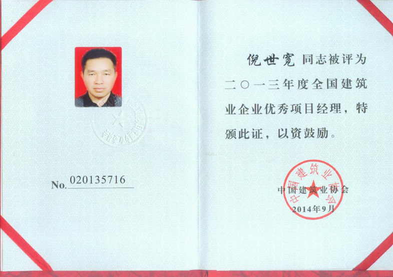 2013年度全國(guó)建筑業(yè)企業(yè)優(yōu)秀項(xiàng)目經(jīng)理(倪世寬)