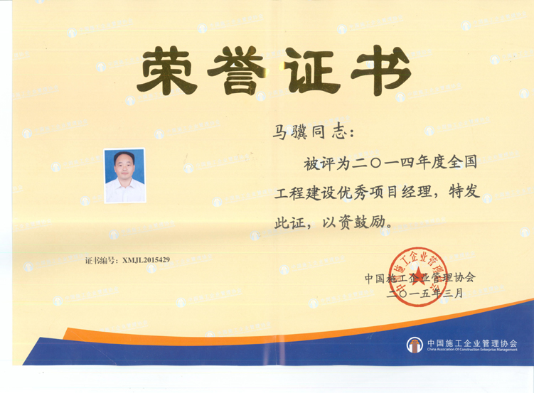 2014年度全國工程建設優秀項目經理(馬驥)