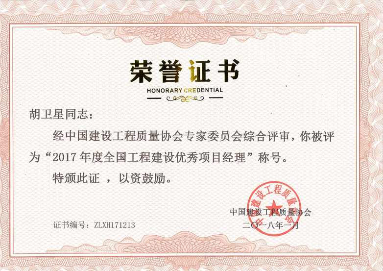2017年度全國工程建設(shè)優(yōu)秀項目經(jīng)理(胡衛(wèi)星)