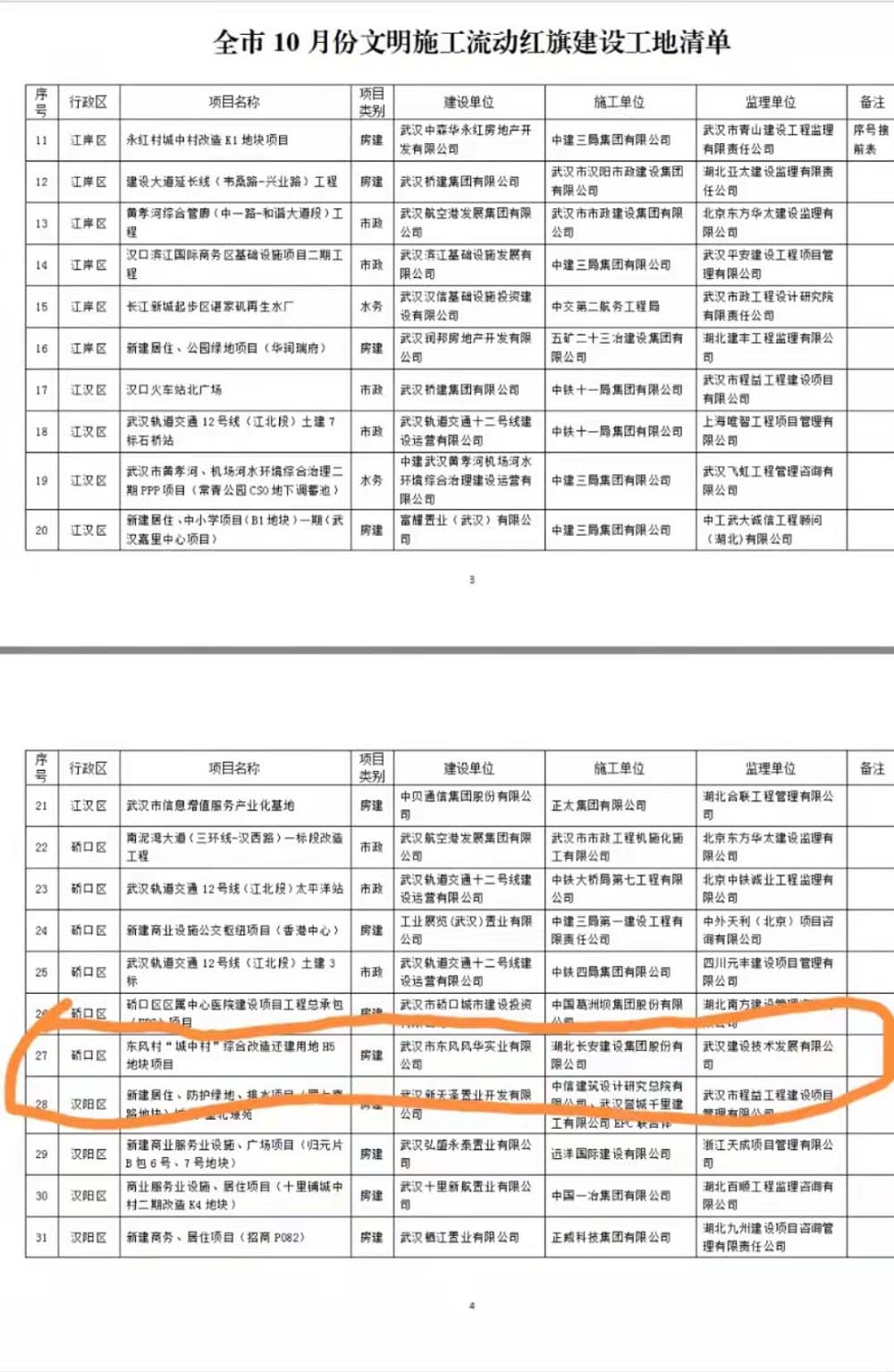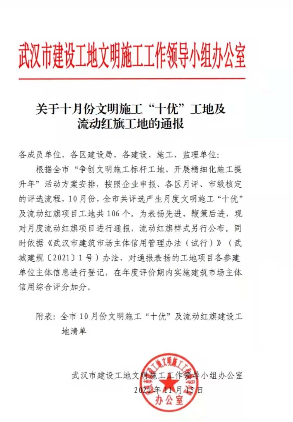 東方村“城中村”綜合改造還建用地H5地塊項目被評為武漢市10月份文明施工流動紅旗建設工地