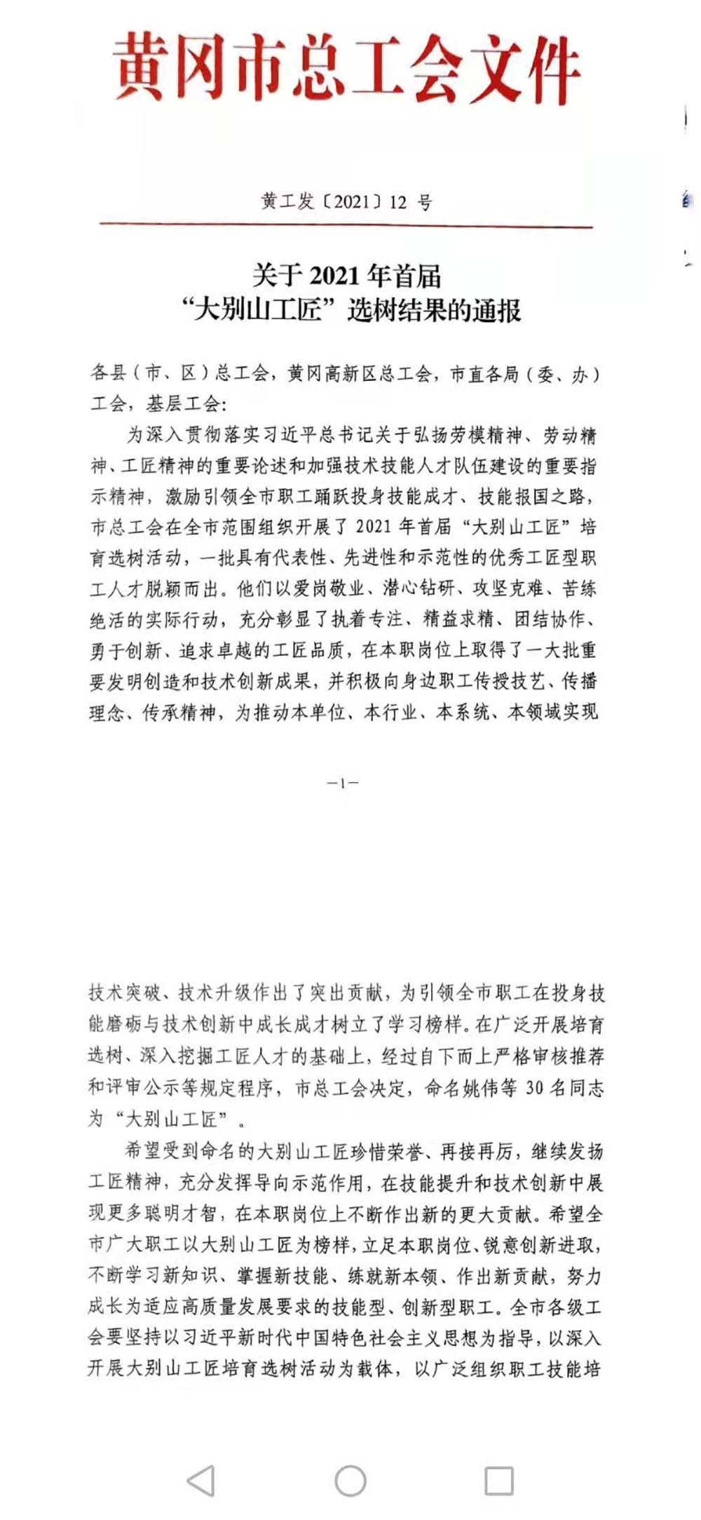 黃岡市總工會授予袁浩“大別山工匠”榮譽稱號