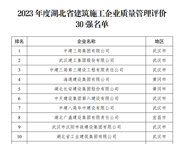日前,湖北省建設工程質量安全協會官網發布了《關于公布2023年度湖北省建筑施工企業質量管理評價30強名單的通知》,湖北長安建設集團股份有限公司在30強中排名第5位,比上一屆上升4位。