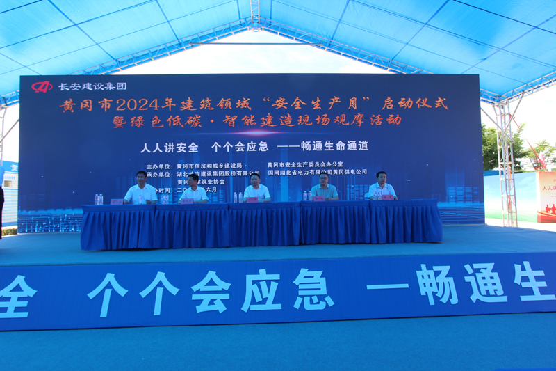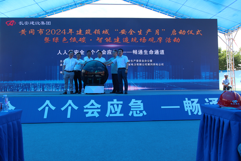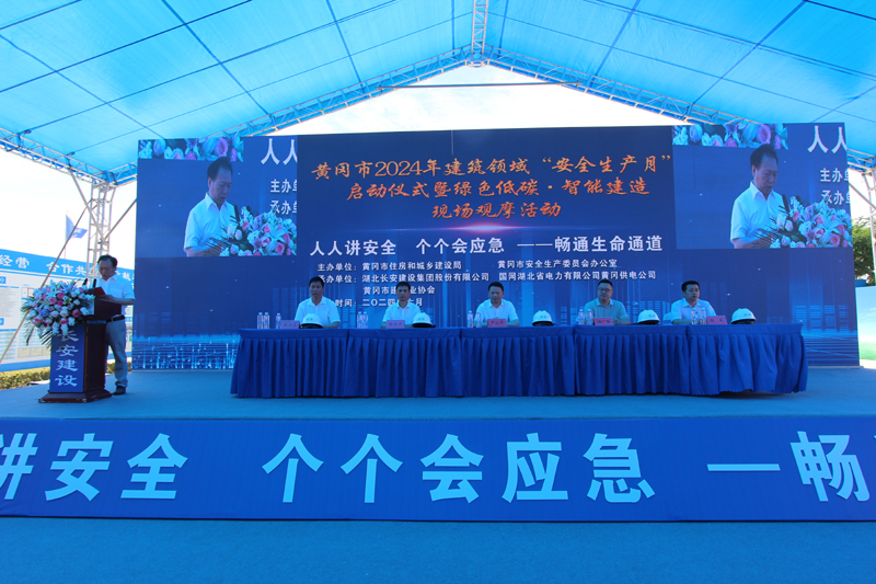 2024年6月是第23個全國安全生產月,主題為“人人講安全、個個會應急—暢通生命通道”。為了進一步強化安全意識,壓實安全責任,提高應急處置能力,由黃岡市住房和城鄉建設局、黃岡市安全生產委員會辦公室主辦以及湖北長安建設集團股份有限公司、國網湖北省電力有限公司黃岡供電公司、黃岡市建筑業協會協辦的黃岡市2024年建筑領域“安全生產月”啟動儀式暨綠色低碳?智能建造現場觀摩活動,于6月3日在國網湖北省電力有限公司黃岡供電公司生產綜合用房項目舉行。國網湖北省電力有限公司黃岡供電公司三級職員張成同志致歡迎辭,湖北長安建設集團股份有限公司副董事長、總經理葉發保作經驗交流發言。黃岡市住建局黨委書記、局長尹小軍以及黃岡市建筑業協會會長、湖北長安建設集團董事長段衛昌出席會議并講話,與主席臺領導嘉賓共同啟動觸摸球,標志著以國網湖北黃岡供電公司生產綜合用房項目為引領的黃岡市2024年建筑領域“安全生產月”活動正式啟動,全面展開。