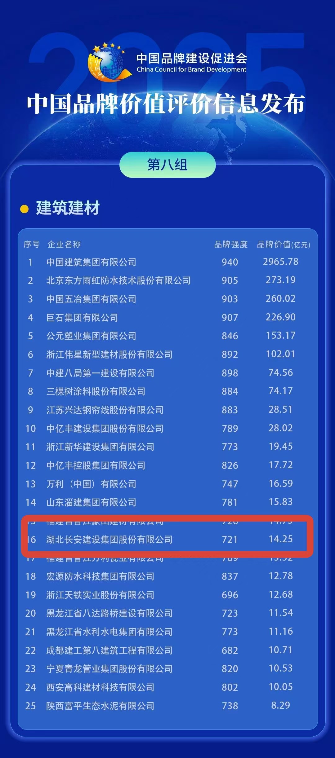 5月10日,在浙江省德清縣召開的2025世界品牌莫干山大會上,中國品牌建設促進會、中國資產評估協會、新華社等單位聯合對“2025中國品牌價值評價信息”開展權威發布。英山縣本土企業品牌、“湖北長安建設集團股份有限公司”入圍建筑建材組榜單第16位,其品牌強度為721,品牌價值14.25億元,較上一年度增長1.04億元,再創歷史新高。