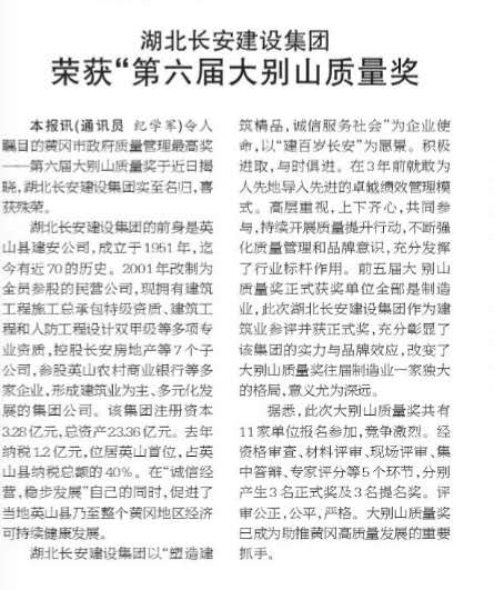 湖北長安建設集團榮獲“第六屆大別山質量獎”