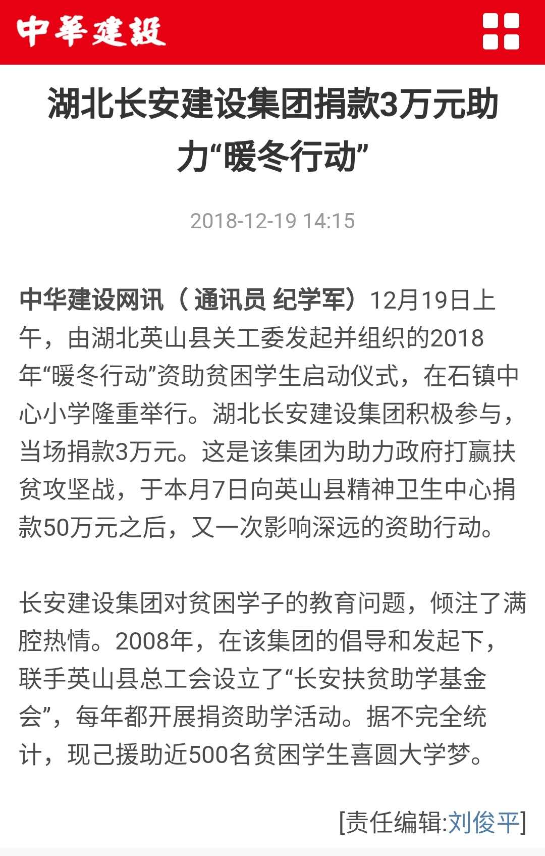 湖北長安建設(shè)集團捐款3萬元助力“暖冬行動”