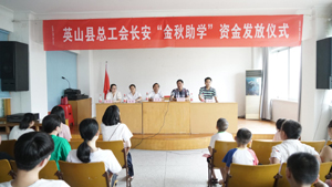8月29日上午,英山縣總工會長安“金秋助學"資金發放儀式在集團四樓會議室舉行,向60余名貧困學生現場發放助學金。金秋助學活動由長安建設集團倡議并發起,持續了20余年。