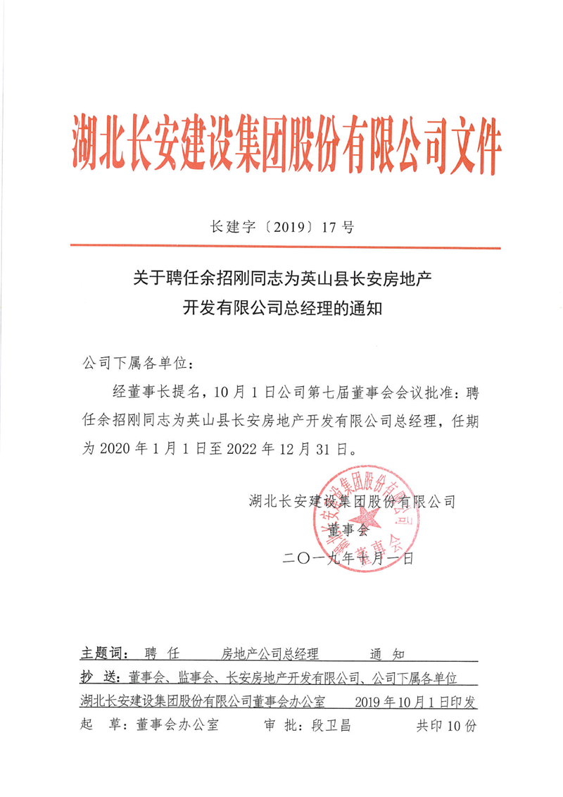 關于聘任余招剛同志為英山縣長安房地產開發有限公司總經理的通知