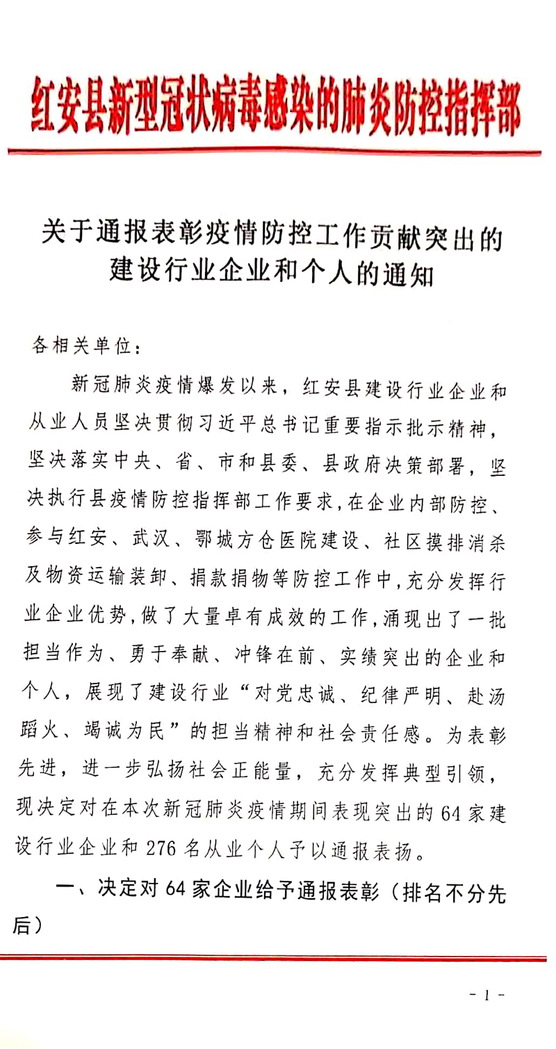 紅安縣疫情防控指揮部對集團及個人予以表彰