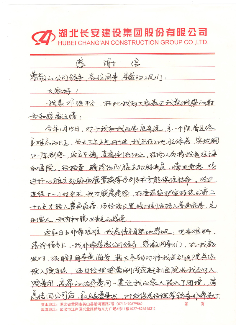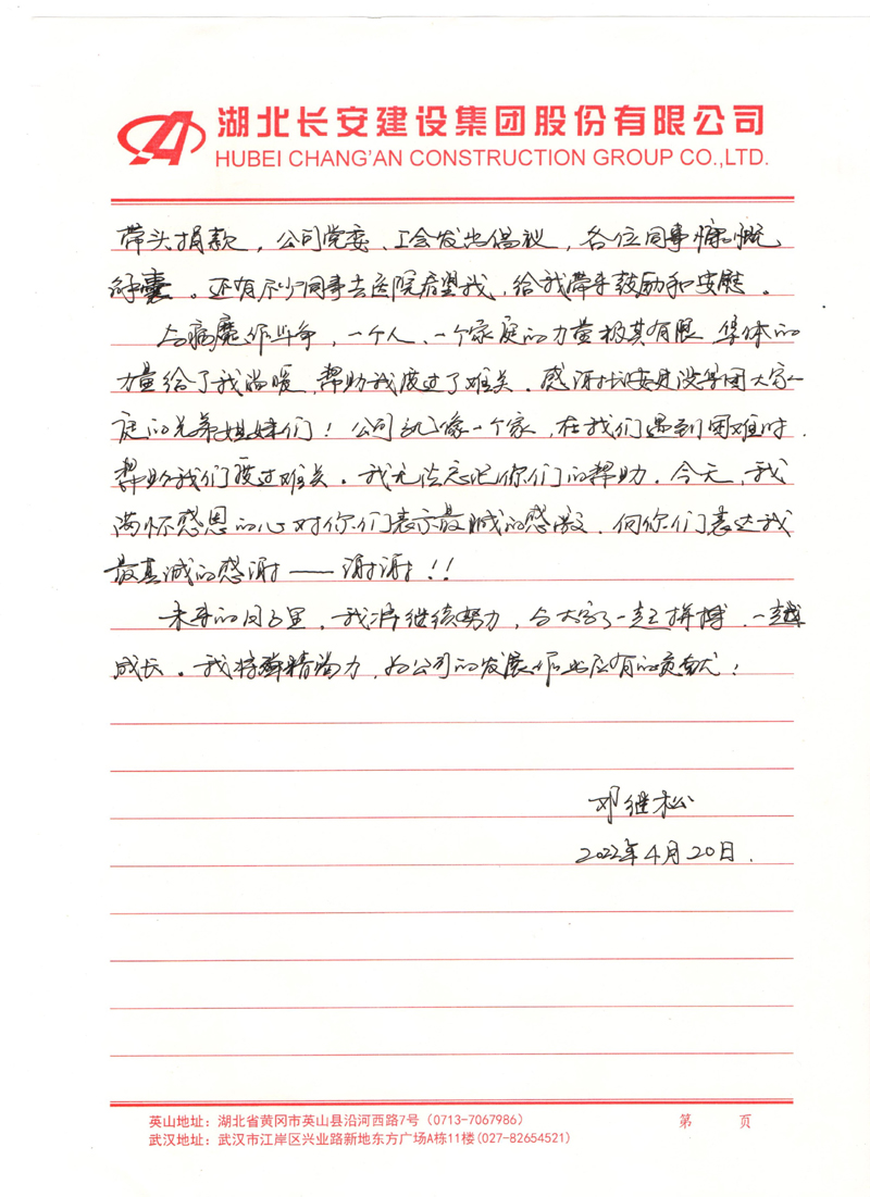 1月8日,集團公司黨委開展2021年度困難職工幫扶活動,經過深入調查摸底和專題會議研究,向沈楨等11位困難職工給予每人4000-5000元的困難生活補助;1月26日,當獲悉鄧繼松遭受病痛折磨,正在武漢住院治療的消息。集團公司工會主動安排專人上門看望慰問,并向全體員工發出捐款獻愛心的倡議。在不到1天的時間里,共收到愛心款107840元。讓職工切切實實感受到長安大家庭的溫暖,體現了組織和領導對職工深厚而真摯的人文關懷,增強了員工的凝聚力和向心力。(附:鄧繼松《感謝信》)